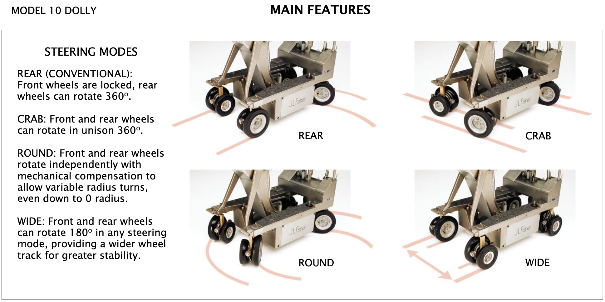 Three steering modes: crab, conventional, and round steering for tight radius turns
